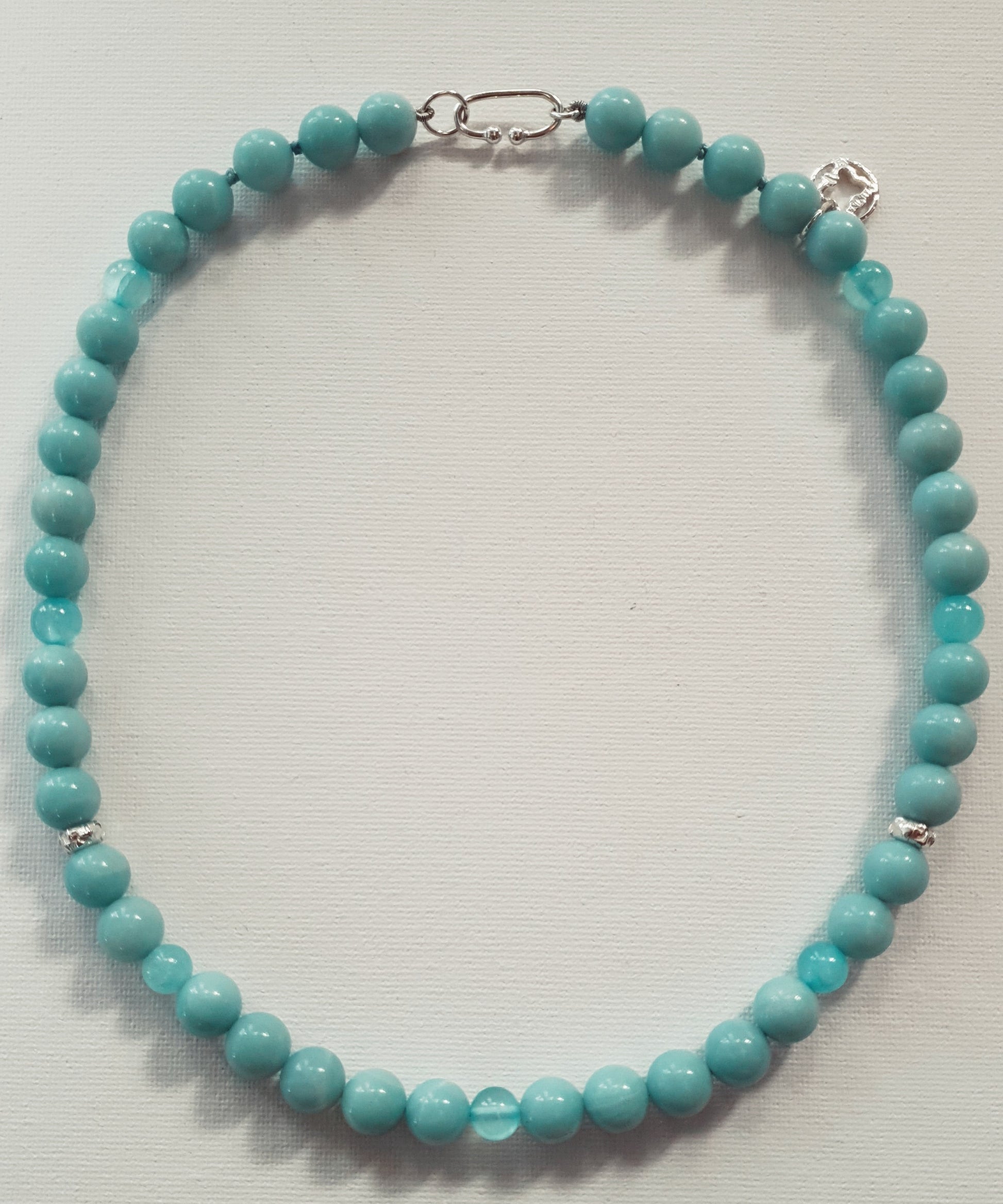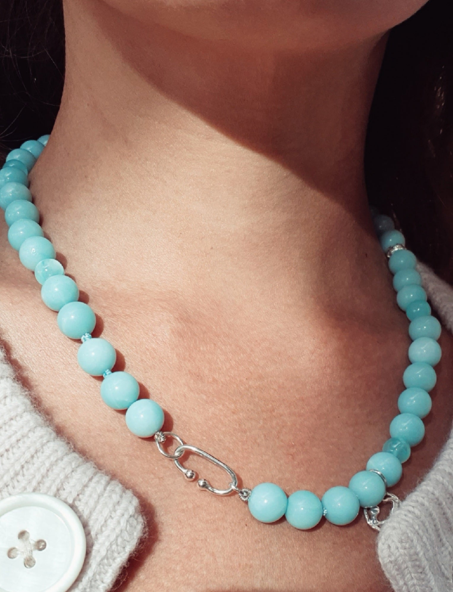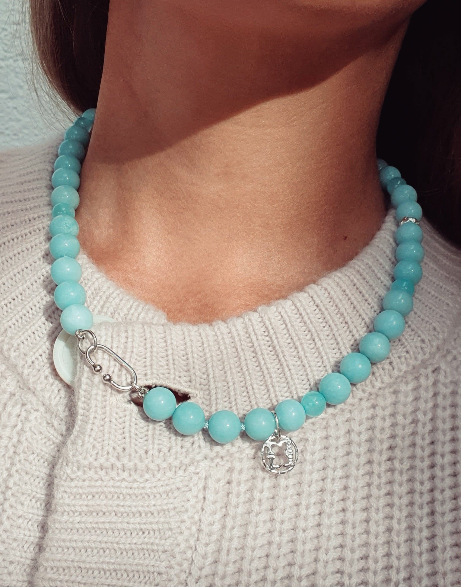 Lass dich von der sanften Energie des Ozeans umhüllen – mit der Kette „Sedna“, benannt nach der Inuit-Göttin des Meeres. Der schimmernde Amazonit erinnert an türkisblaues Wasser und steht für Ruhe, Harmonie und Selbstvertrauen.