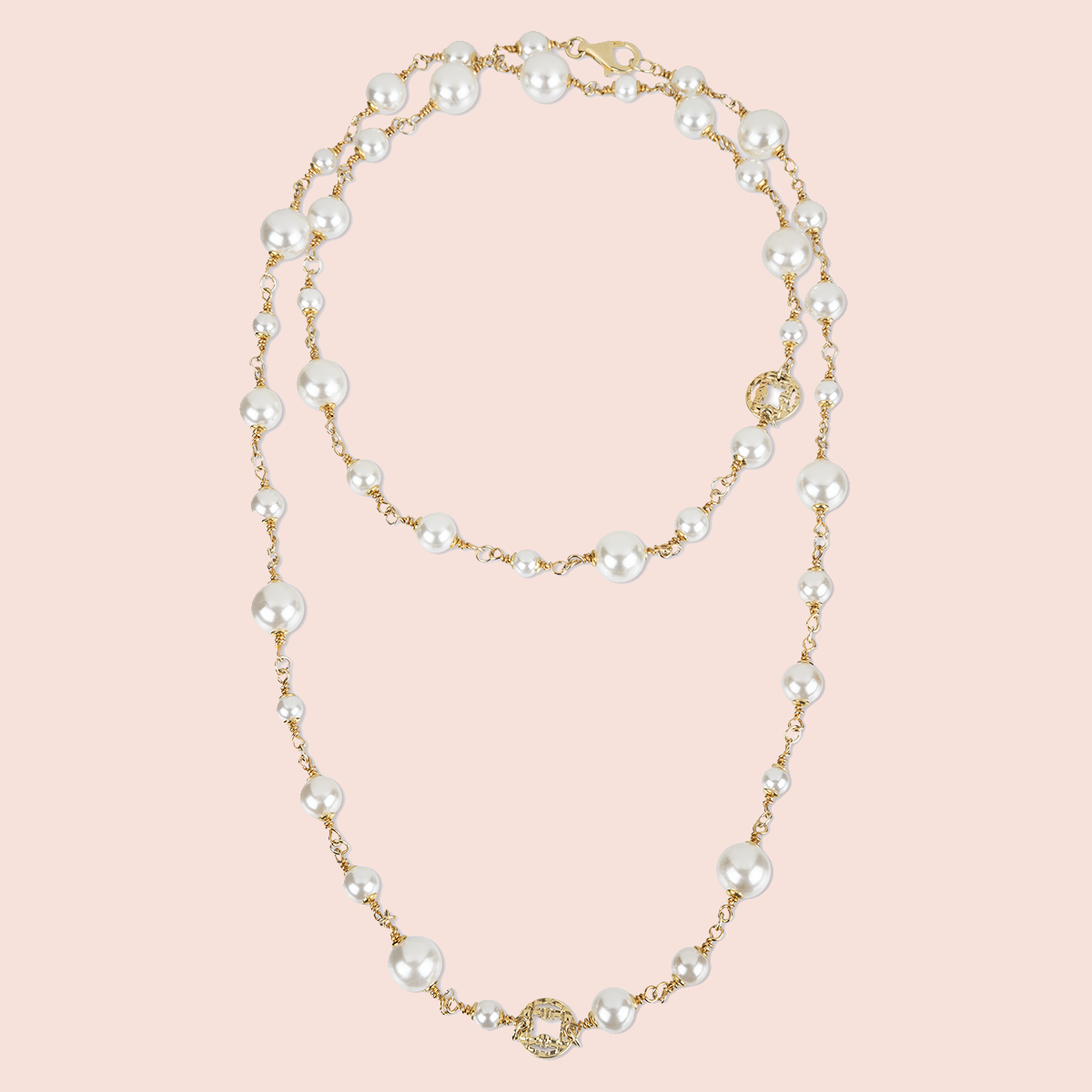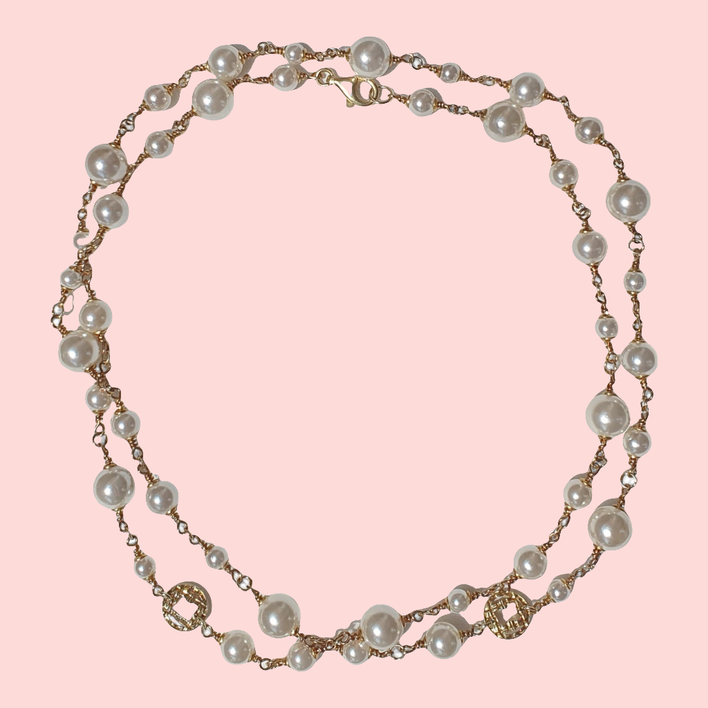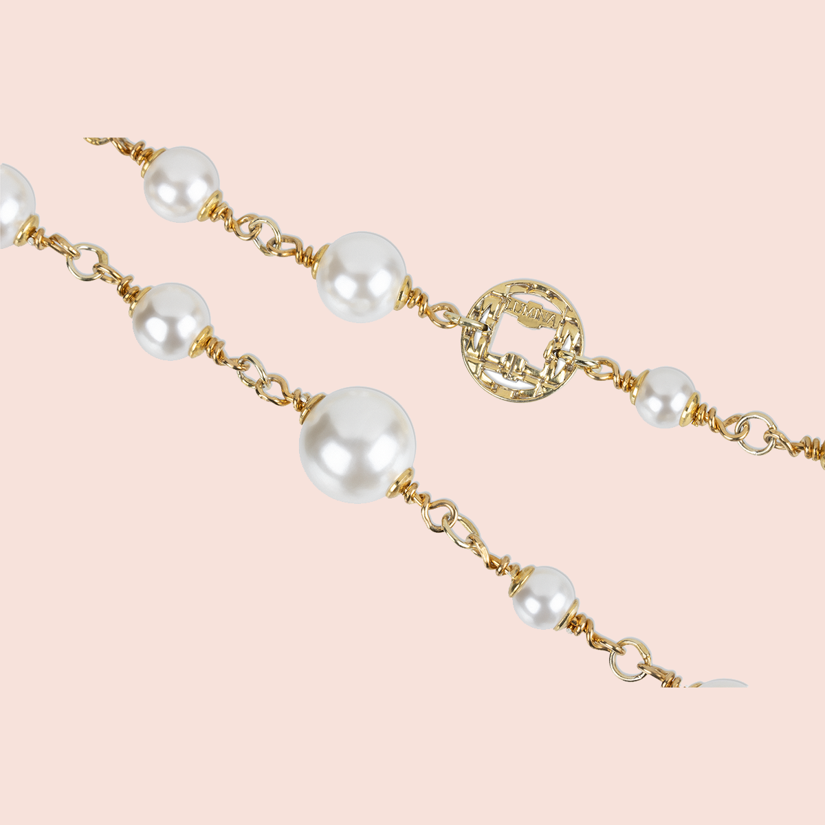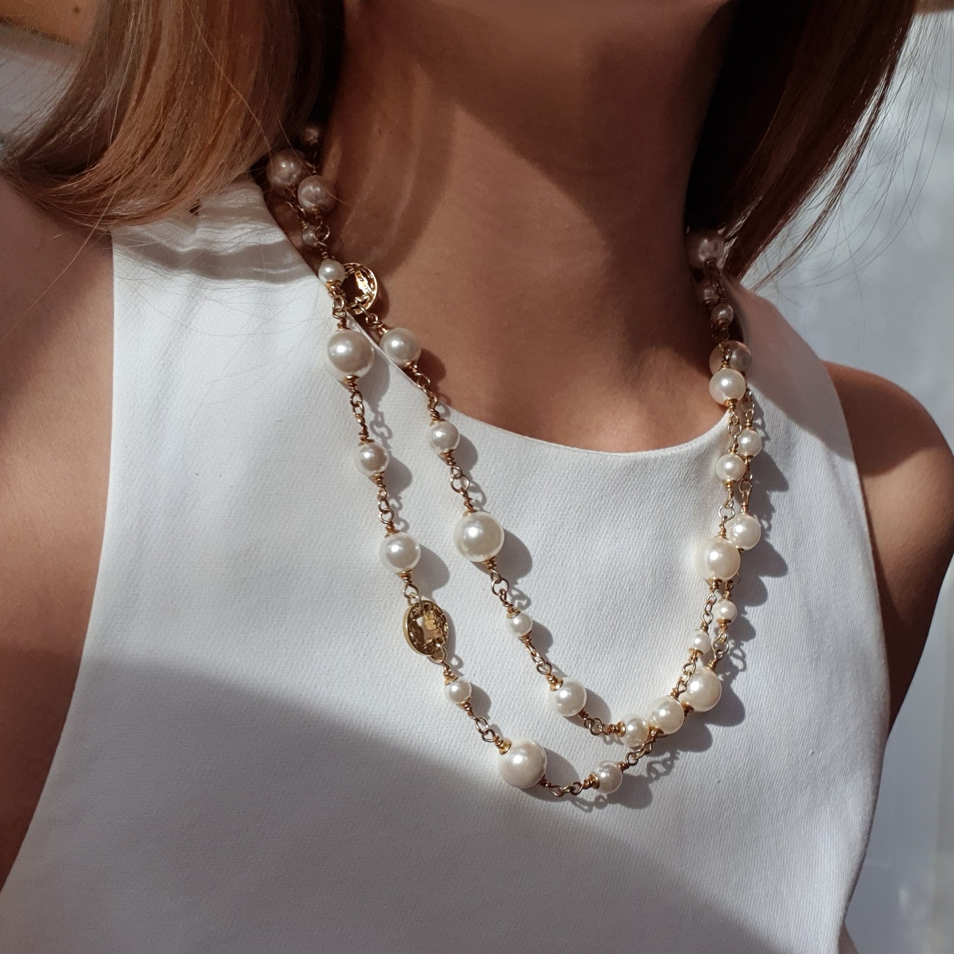 Die goldenen Details der Kette ergänzen das spielerische Design wodurch diese Perlenkette modisch und elegant erscheint.