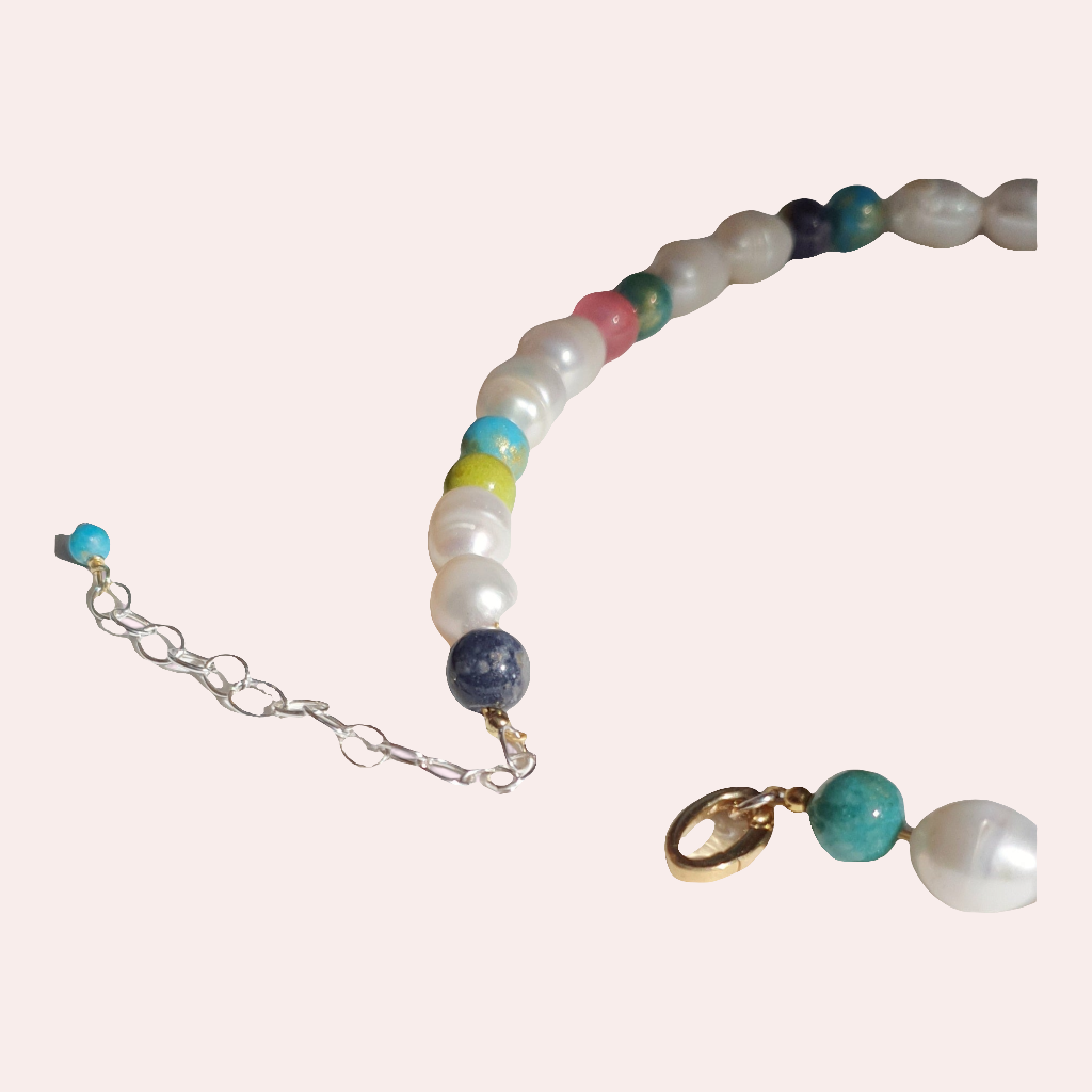 Die Kette besteht aus verschiedenen Halbedelsteinen und Süßwasserperlen. Details der Kette sind aus 925 Sterling Silber gefertigt und teilweise 24K vergoldet.